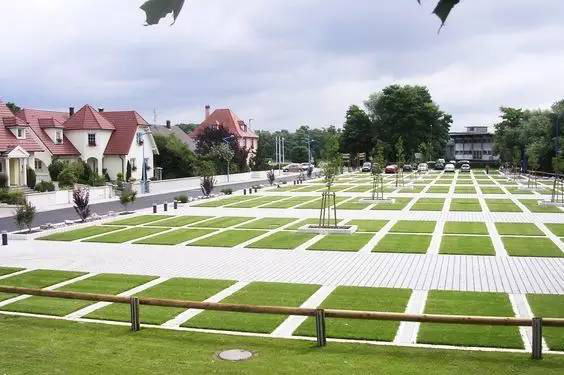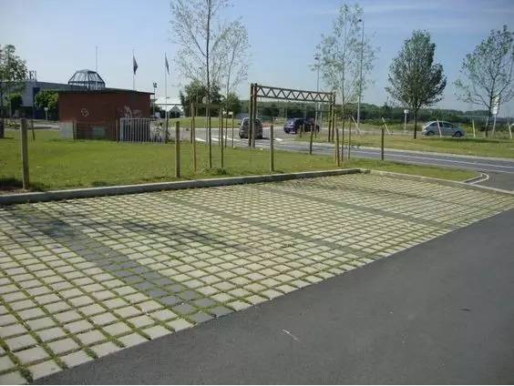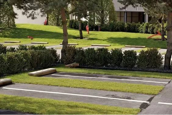 利于更換及修補(bǔ)的防滑鋪裝材料,以及它的透水性,加上鋪設(shè)尺寸符合人體工程學(xué),真是人性、環(huán)保、安全而美觀。而停車場(chǎng)周圍的綠植,起到降溫作用,視覺上也美化了場(chǎng)景,愉悅內(nèi)心,安全出行,再好不過。