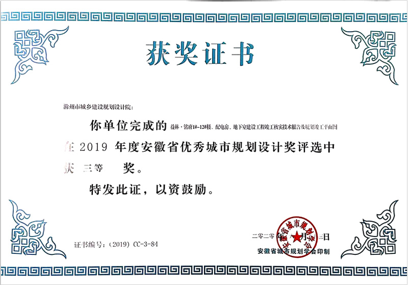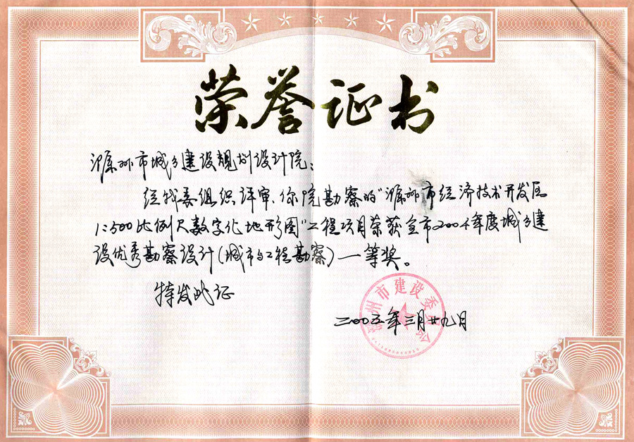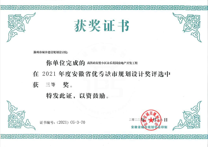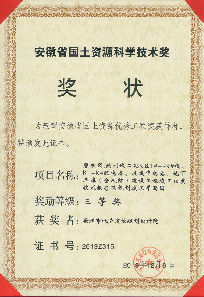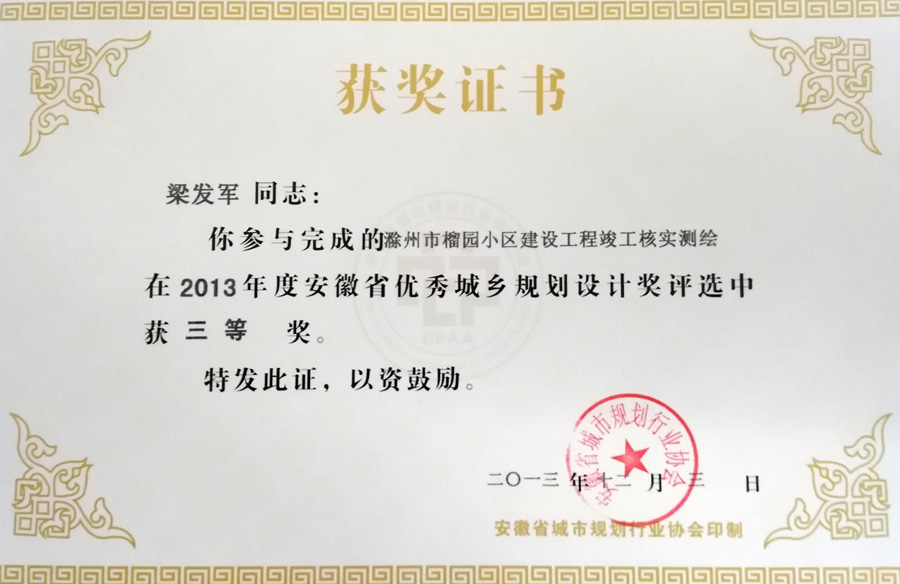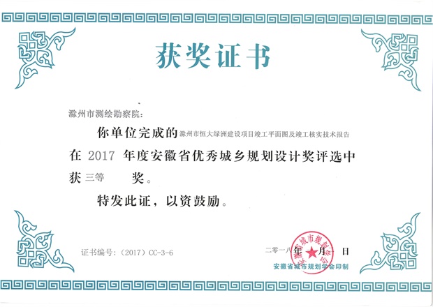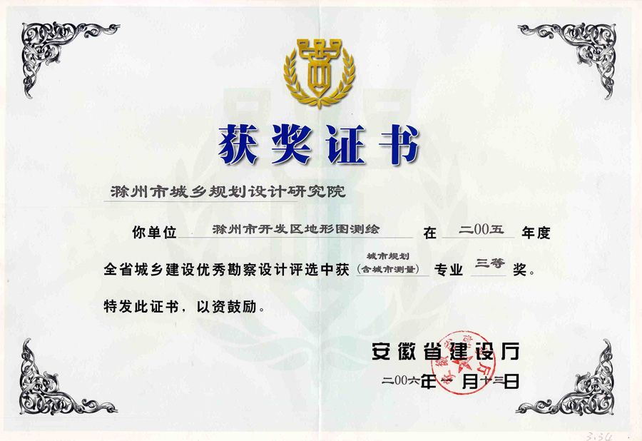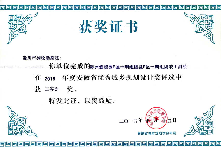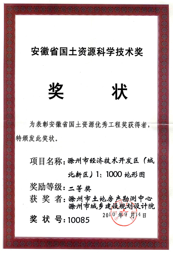 滁州市經(jīng)開區(qū)地形圖測繪規(guī)劃獲獎(jiǎng)證書
